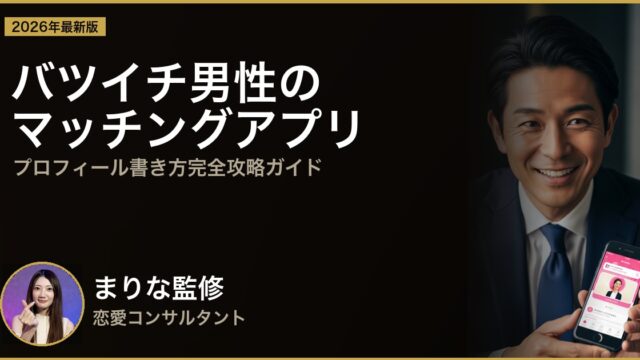 バツイチ・再婚 【2026年最新】バツイチ男性のマッチングアプリ プロフィール完全攻略|離婚歴の書き方・写真・自己紹介文 バツイチ男性がマッチングアプリで成果を出すプロフィールの作り方。離婚歴の書き方・写真選び・自己紹介文テンプレートを恋愛コンサルタントまりなが解説。 2026.03.07 バツイチ・再婚マッチングアプリ