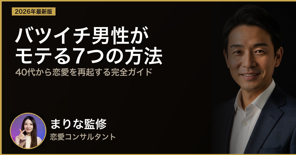 40代・50代バツイチ男性専門の恋愛コンサルタント。Men’s Restart Lab を監修。離婚後の恋愛再起・再婚をサポートしてきた実績多数。得意分野:マッチングアプリ最適化、外見改善、自己肯定感の回復支援。
