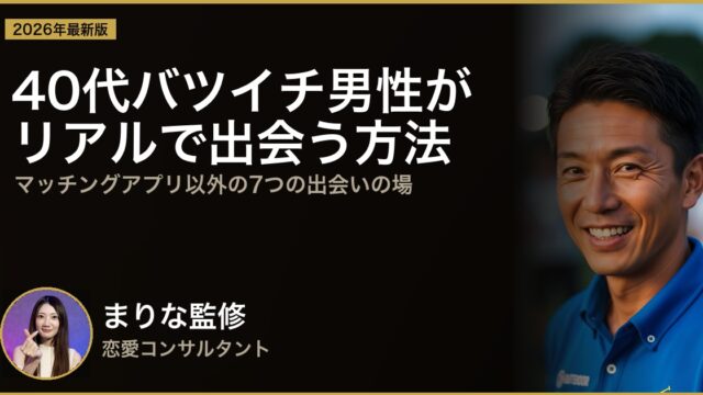 40代バツイチ男性に効果的な出会いの場所を徹底比較。マッチングアプリ(Pairs・Omiai・ゼクシィ)・婚活パーティー・趣味コミュニティのコスト・特徴・向き不向きを恋愛コンサルタント まりな監修で解説。子持ちバツイチの戦略も紹介。
